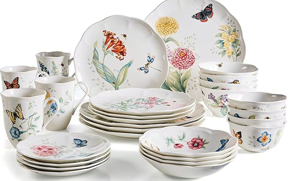 - Lenox- Butterfly Meadow Dinnerware Set: Bring the beauty of nature to your table with the 18-piece Butterfly Meadow Dinnerware Set, featuring lively butterflies, dragonflies, and bumblebees dancing amongst vibrant blooms. Crafted from durable white ceramic porcelain with scalloped edges, this set offers service for six in timeless elegance.