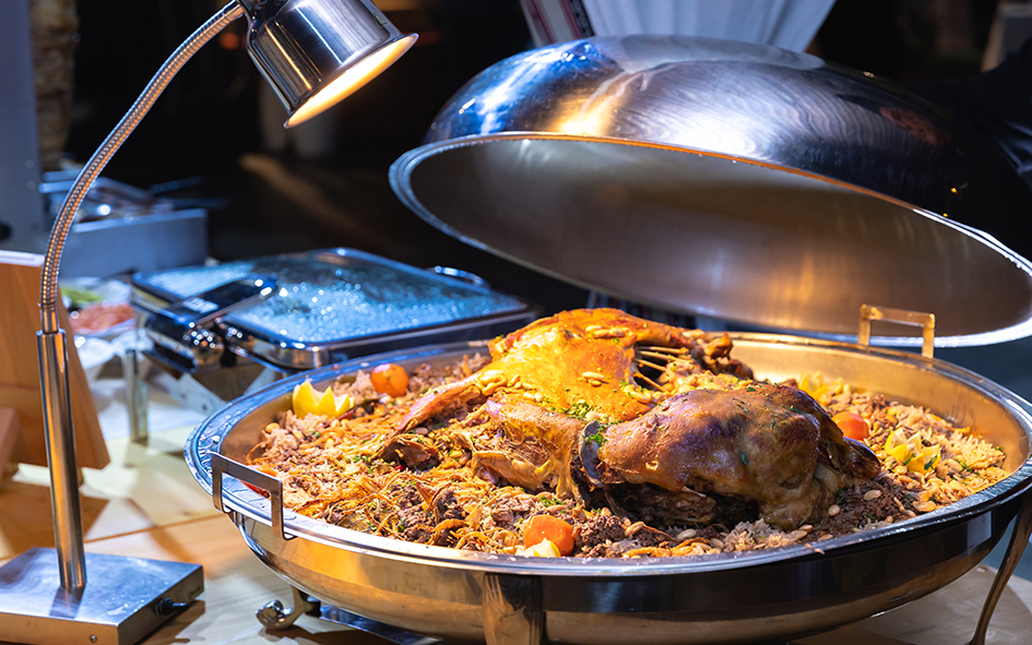 - Buffet highlights include dates, dried fruits, traditional beverages, mezze, aromatic grills, global favorites, desserts, plus live Arabic music
