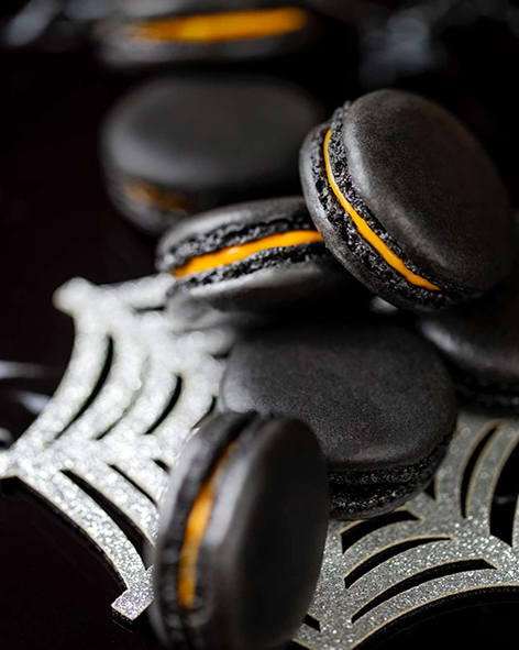Dare to try the Mystery Macaron: black popcorn macaron shells filled with vibrant orange ganache for a bold, Halloween-ready twist.