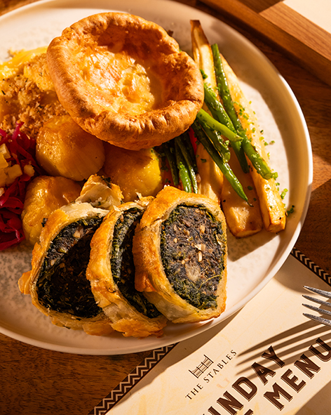For mains, the traditional Roast Turkey with duck-fat potatoes, herb stuffing, and all the trimmings takes centre stage, while vegetarians can enjoy the hearty Wild Mushroom & Walnut Wellington. Desserts include seasonal favourites such as the indulgent Yule Cake or spiced Carrot Cake topped with ginger cookies and citrus zest.